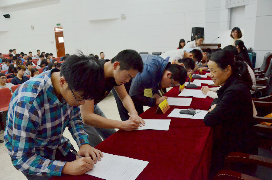 各班班长走上台,庄重严肃地签署承诺书。