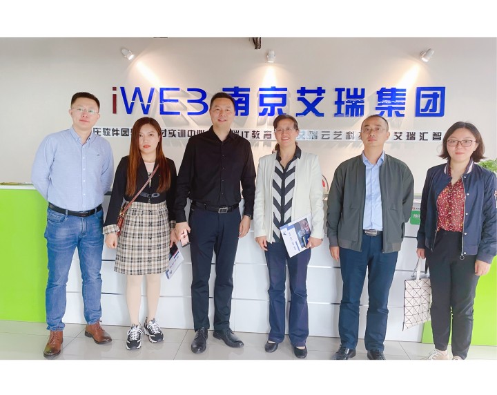 院党委书记周亚芳带队走访南京艾瑞集团。南京艾瑞集团总经理徐彬、校企合作总监陈韩和信息工程巴比伦娱乐场