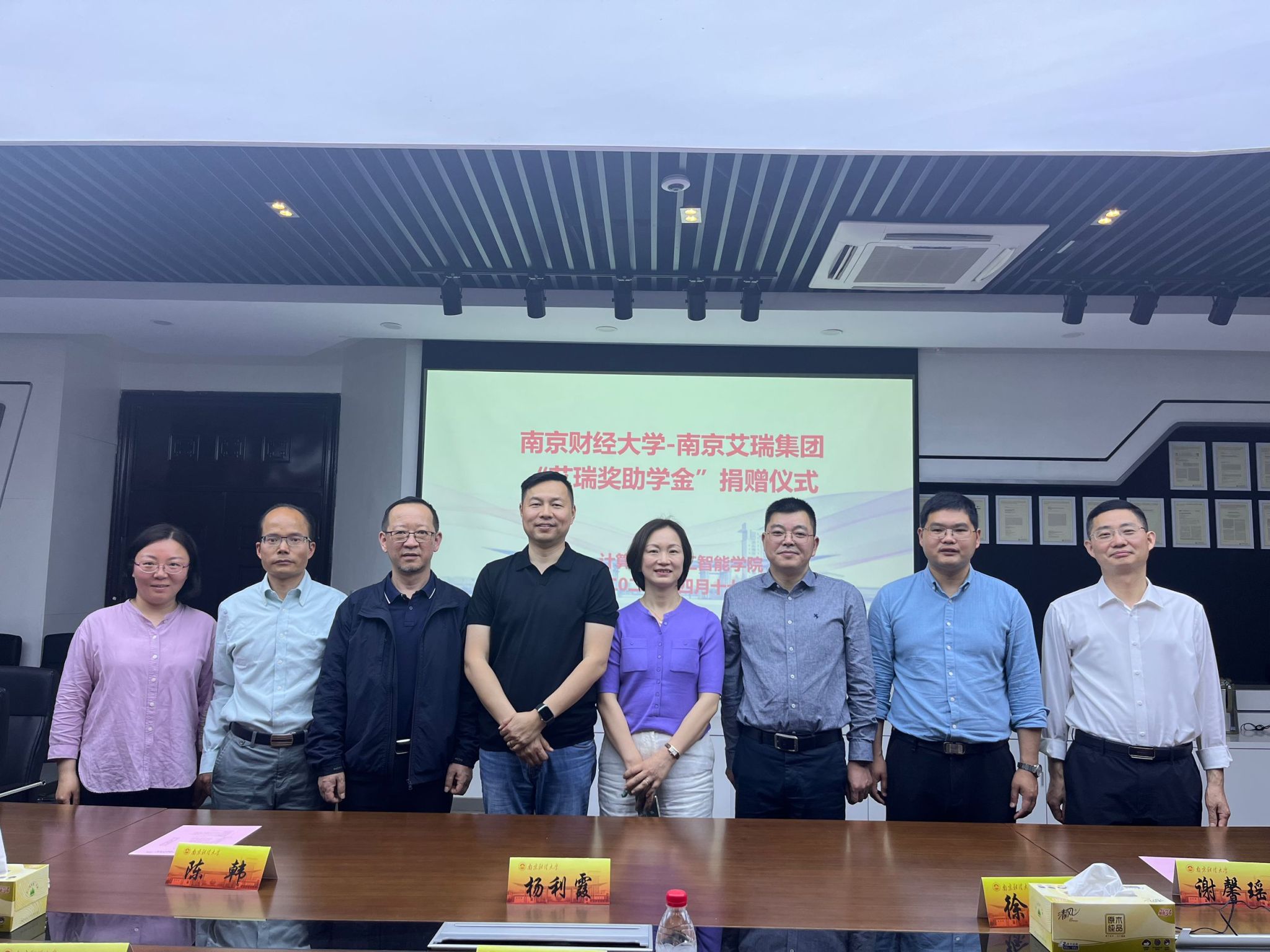 在仙林校区德业楼Z4-211会议室举行“艾瑞奖助学金”捐赠签约仪式。南京艾瑞集团董事长杨利霞、总经理徐彬、市场总监陈韩、项目专员谢馨瑶,巴比伦娱乐场