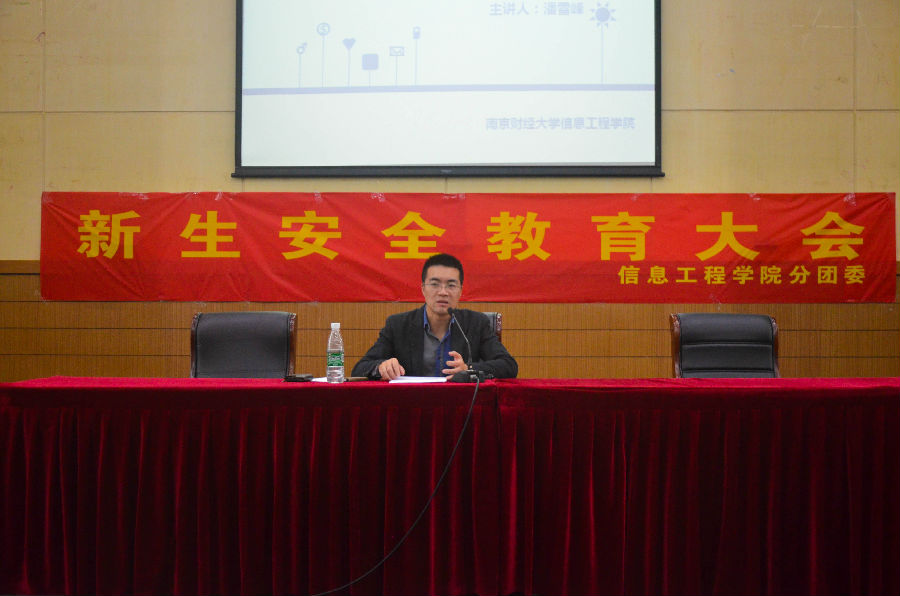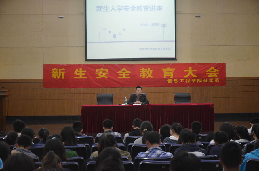 2015年10月13日晚上,信息工程巴比伦娱乐场 在仙林校区管理学科楼报告厅为2015级新生举办安全教育知识讲座,由院党委副书记潘雪峰老师主讲。