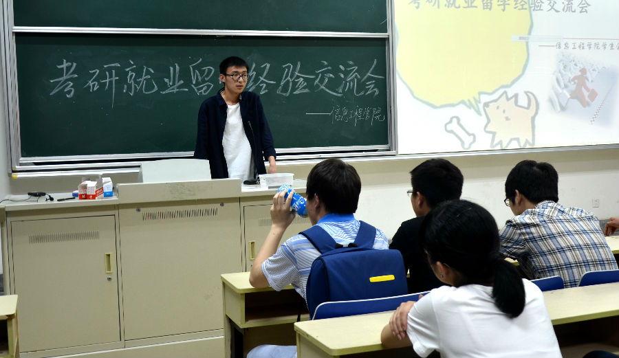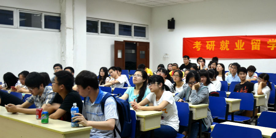 时要均衡处理好学习、社团、兴趣之间的关系,最重要的是要巩固自己所学习的专业知识。接着又在简历的制作和面试的过程方面给了我们一些建议,例如要在简历中突出自己的技能,在面试时要根据自己应聘岗位的不同而改变策略且要实事求是,引领面试官到自己所擅长的领域。此外,他们还告诉大家在实习时,无论是大公司还是小公司,都要认真去做,这样才能学到一定的专业知识和新技能。最后,学长告诉我们团队很重要,一定要有团队精神。孔澎欣和周梦源两位学长分享了他们考研的历程。他们都指出:不能将考研的战线拉的太长,但也不能太短,要根据自己的实际情况而定;专业课很重要,一定要好好学习并及时复习;复习资料也很重要,选择合适的复习资料是考研的关键,学长们通过自己的经验,向我们推荐了好多优秀的复习资料;要找一个比自己自律性更好的人去约束自己;最好不要上考研班。最后是李妤学姐和成昱昊学长分享他们出国留学时所做的准备。首先是要有良好的平日成绩,其次要通过雅思考试。同时他们也告诉大家要根据自己的实际情况考虑是否要出国及申请的大学排名等一些需要注意的问题。