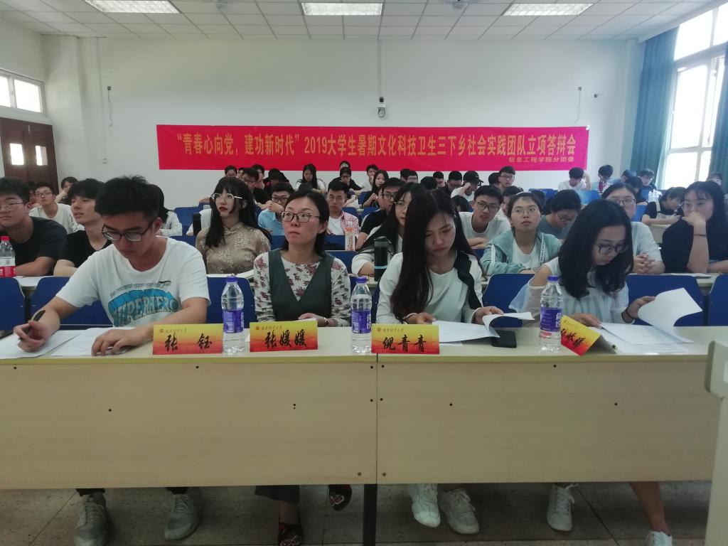 仙林校区德业楼113教室举行举办了“青春心向党,建功新时代”2019大学生暑期文化科技卫生下乡社会实践团队立项答辩会。参与这次团队立项答辩会的评审嘉宾有信息工程巴比伦娱乐场