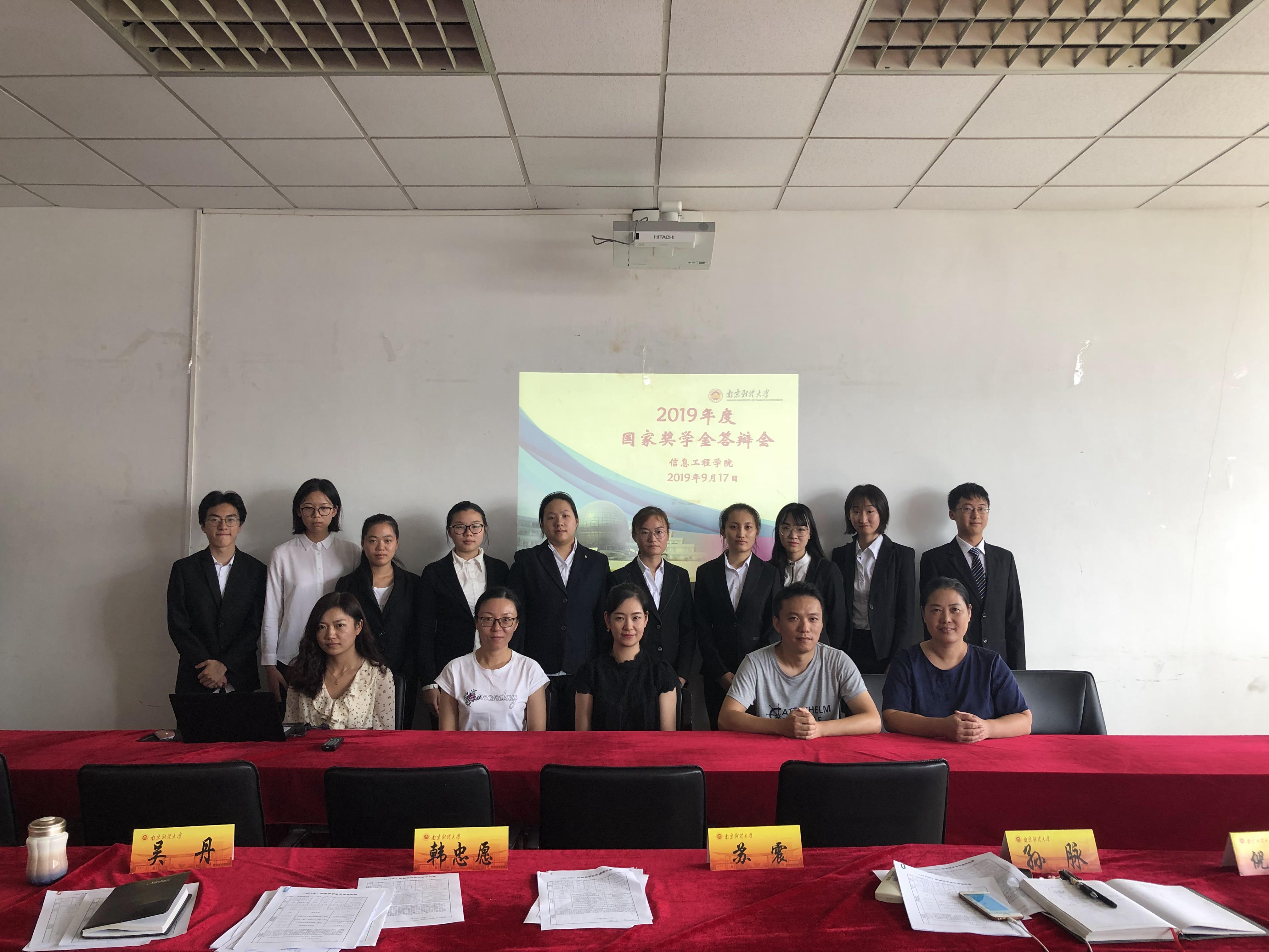 在仙林校区德业楼406举办2019年度国家奖学金答辩会。评委老师有党委书记韩忠愿,党委副书记吴丹,团委书记张媛媛,班主任代表苏震,辅导员孙脉、倪青青、张闻等老师以及学生骨干代表。