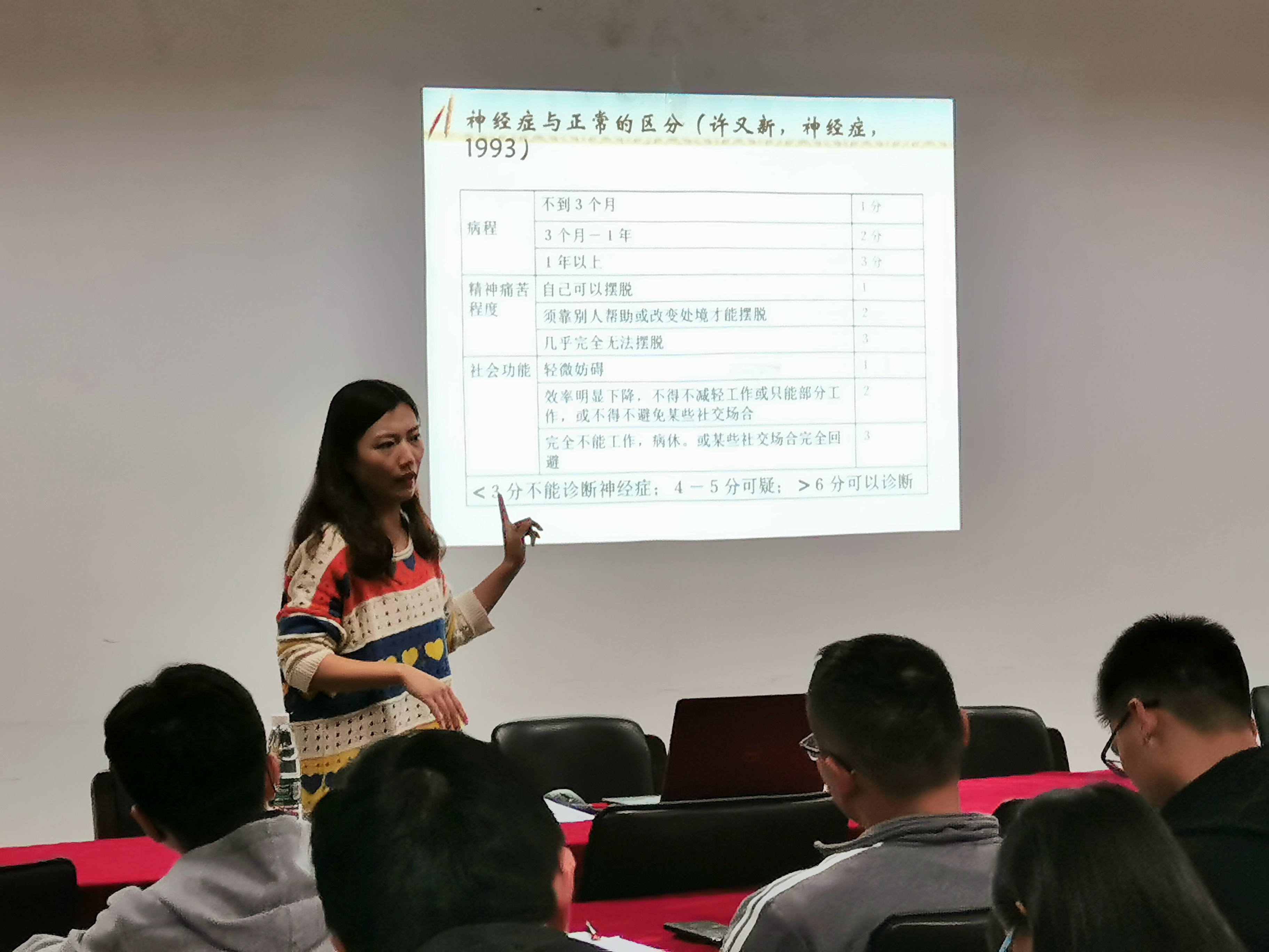 讲座上,倪青青老师首先由一个心理短片“91厘米的偏差”引出本次讲座的主题,就抑郁症,神经类疾病,一般心理问题、严重心理问题、部分可疑神经症,神经症的临床分型,神经症的诊断标准,心理常形和变形,心理诊断的标准和原则等方面展开阐述;随后倪青青老师还向同学们展示了部分心理问题案例,进一步加深大家对心理健康知识有了一定的了解,帮助大家建立起关于心理问题的基本判断能力。