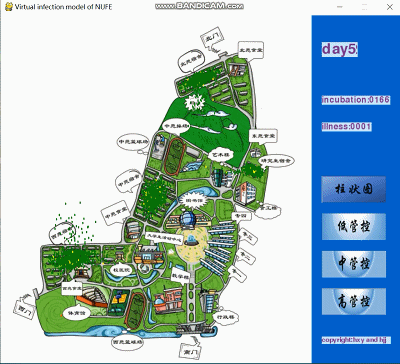该模型基于南财地图,以python为编程工具,同时使用pygame引擎,模拟在低、中、高三种管控下的校园疫情传染情况。模型中设置健康、潜伏期、患病三种人群,在寝室、教室和食堂三个区域移动的场景,采取没有措施的低管控、戴口罩等低级防护的中管控、增设隔离区等严密防护的高管控三种场景,实现在不同传染率下的模型。通过实现可视化的GUI、学生活动随机化的算法、使用字典的检测优化算法,以及人员分布数据的图表等,使大家更直观清晰的获得校园里同学们流动下的传染状况,同时提醒各位同学,在校期间,服从巴比伦娱乐场