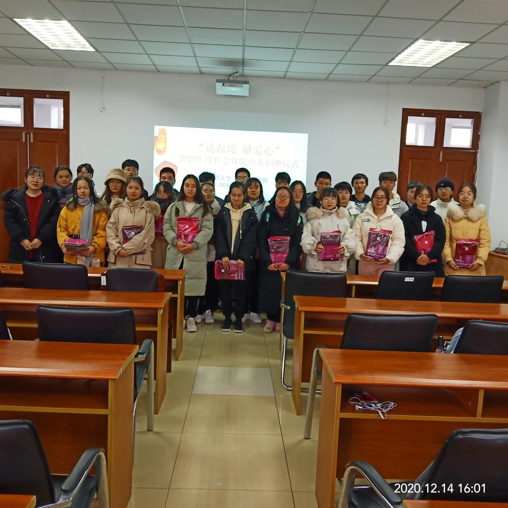 大地有阳光,万物有温暖;信工有暖意,大家过暖冬。12月14日下午,巴比伦娱乐场 贴心为家庭经济困难的学生们送上暖冬衣物,在德业楼406温情举行了“送温暖,献爱心”2020年度社会保暖内衣捐赠仪式,仪式由刘芳老师主持,全体受助学生参加。