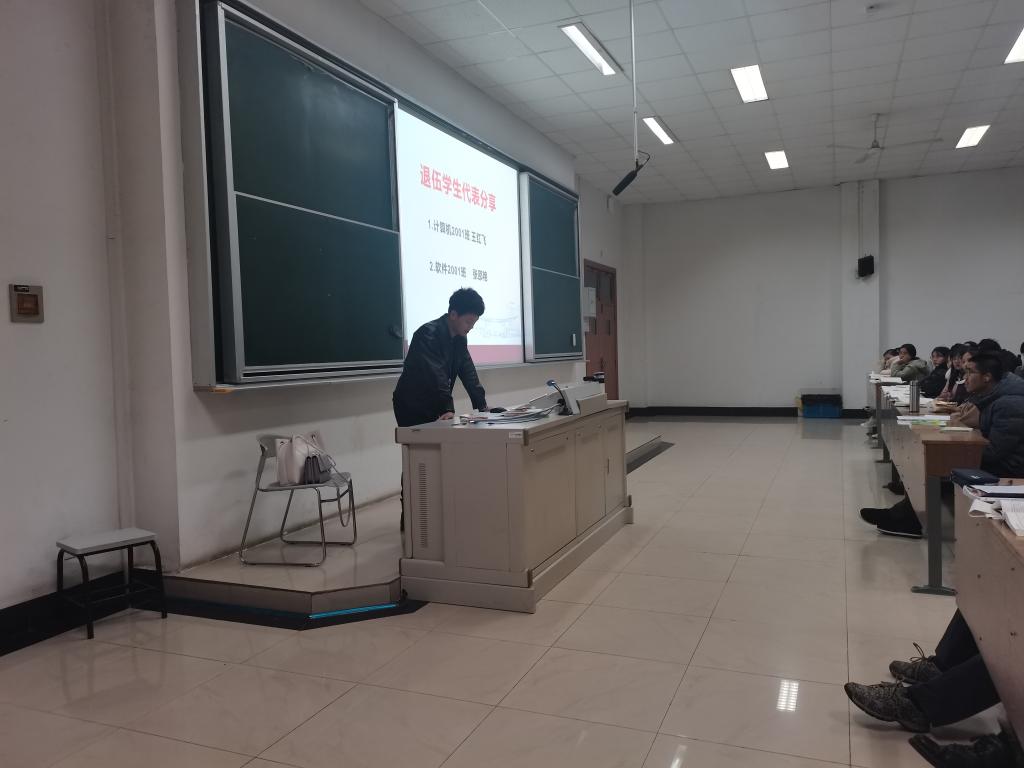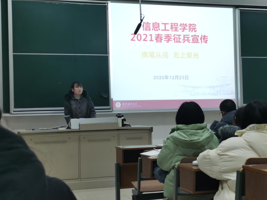 在JB301开展了2021春季大学生征兵宣讲,宣讲会由辅导员刘芳老师主持,20级全体同学参加。