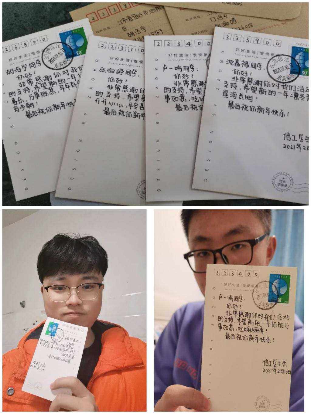 在身边的感觉,同学们身远心近。通过我自己线上参加活动,既能够放假在家做一些有意义的事情,还可以收到来自学生会的新春贺卡。这个贺卡是对自己的肯定,同时也是鼓舞,让我知道了自己分享的事情是有被关注到,自己参加的活动有被重视。希望学生会部长们多提供参与活动的机会,即使放假也能做一下有意义的活动,也能得到肯定的评价。”卢同学:“哇!我新年在家居然还能收到学生会的贺卡,惊喜!学生会的风采,像搏击长空的雄鹰展翅翱翔。回眸过去,历经沧桑,奋发图强;展望未来,前途似锦,英姿飒爽。新年之际,万家团圆,愿学生会越来越好。也祝所有同学们在新的一年元气满满,灾祸退散。”