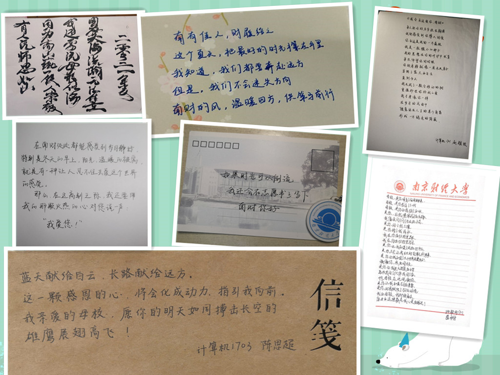 计算机1703班孙巍三行情书表白母校:“如果时光可以倒流,我还会在志愿书上写下,南财你好!”软件(嵌入式)1701班王绪政洋洋洒洒一千字表达自己对自己母校南财的不舍:“感恩母校。您的博大胸怀,使我们在发展方向上拥有充分的个性空间;您的倍加关怀,使我们可以自信地面对任何艰难困苦;您的精心呵护,使得我们顺利完成学业,获得继续深造与建功立业的机会。今天我们要毕业了,但青春不毕业,这次离别只不过是人生的又一个开端。我们带不走母校的一草一木,却带走了母校给予的坚毅、勤奋、踏实和谦虚,去迎接即将到来的挑战。”信管1701班张海勤在《南财情书》中写道:“所有的欢声笑语即将成为亘古的回忆压在心头,所有的激情昂扬都将推着我们迈向未知的将来。过去,南财是我们的依靠;将来,南财是我们的骄傲!”“母校对于我们来说,便如同母亲对于孩子。在这里,我们茁壮成长;在这里,我们奋发图强;在这里,我们从幼稚无知到成熟好学,从茫然失措到目标坚定。饮水思源,永难忘怀,在母亲节到来之时,让我们一起祝愿母校的未来更加辉煌!”21届毕业生们在特殊的日子把特别的爱给了特别的“母亲”。