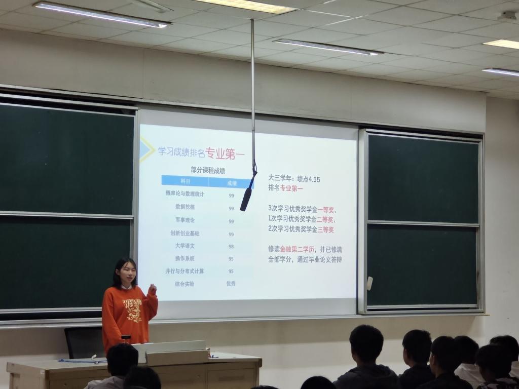 首先上台的是梁惠淇学姐,三年以来,她在大学生涯中取得了平均绩点4.51的好成绩。梁惠淇学姐在现场为新生解答了很多新生关注的考研问题。她详细介绍了考研所必需了解的内容、该如何做好考研的准备和可能出现的问题及解决方法。在场的各位新生都在认真听讲,汲取经验。除此以外,梁惠淇学姐还重点教会了在场新生们如何高效的学习,怎样应对考试,让他们受益良多。