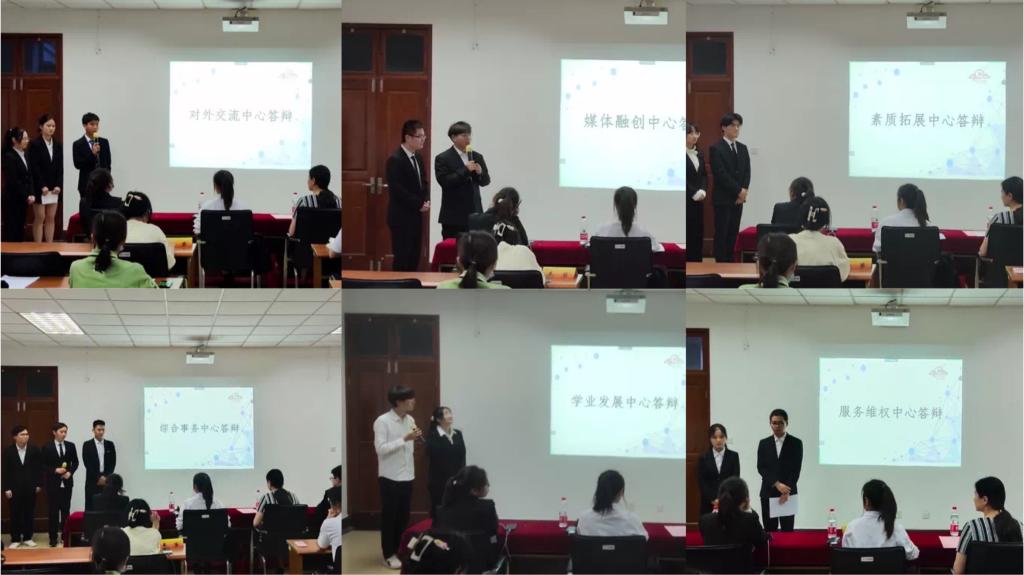 终期述职中,徐静雯同学首先代表主席团总结了学生会本学期的工作内容以及开展的各项活动,提出未来工作必须继续坚持从学生中来到学生中去的工作方法。随后,各中心负责人分别就中心工作进行述职,并完成项目答辩。
