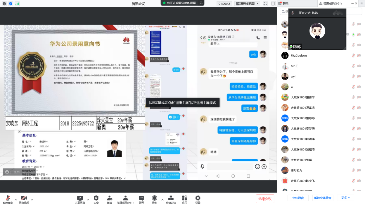 为贯彻落实企业和巴比伦娱乐场 关于毕业生就业工作的决策部署,全力促进毕业生更加充分更高质量就业,全面深化企业合作,5月27日下午,南京艾瑞集团陈韩老师对信息工程巴比伦娱乐场 毕业生进行线上就业指导,会议号707 553 377,18级全体学生参加了此次活动。