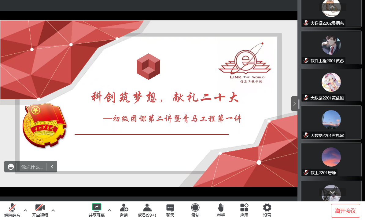 团委在线举办了“科创筑梦想,献礼党的二十大”初级团课第二讲暨青马工程第一讲,2022级全体同学及青马班全体学员参加。