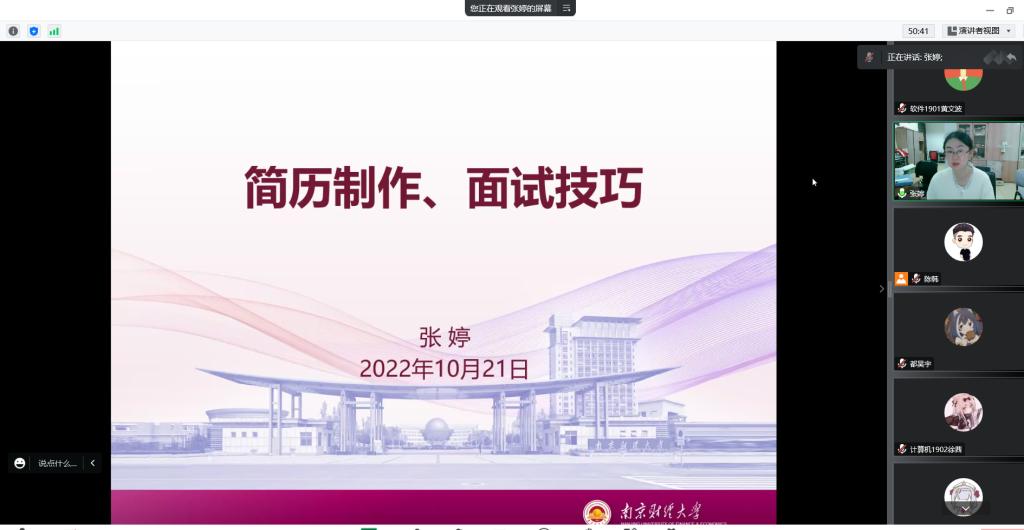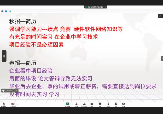 张老师从三个方面进行分享:一是理清严峻的就业形式、了解就业政策,合理规划求职;二是制作创意简历、避免误区,打通职场之路;三是了解面试流程,助力人岗匹配。同时结合案例对所讲内容进行总结概括,并线上与学生互动讲解,气氛十分热烈。