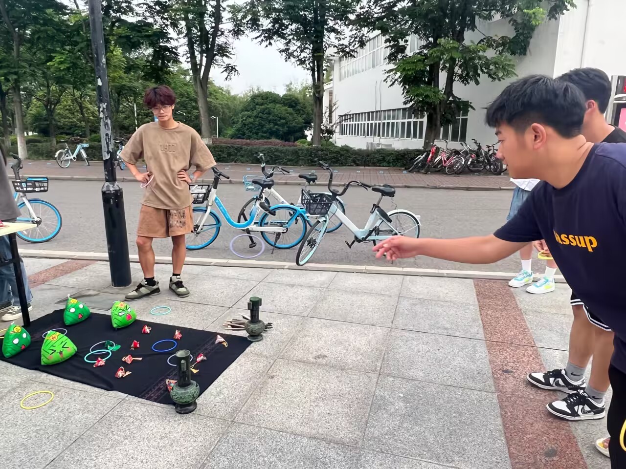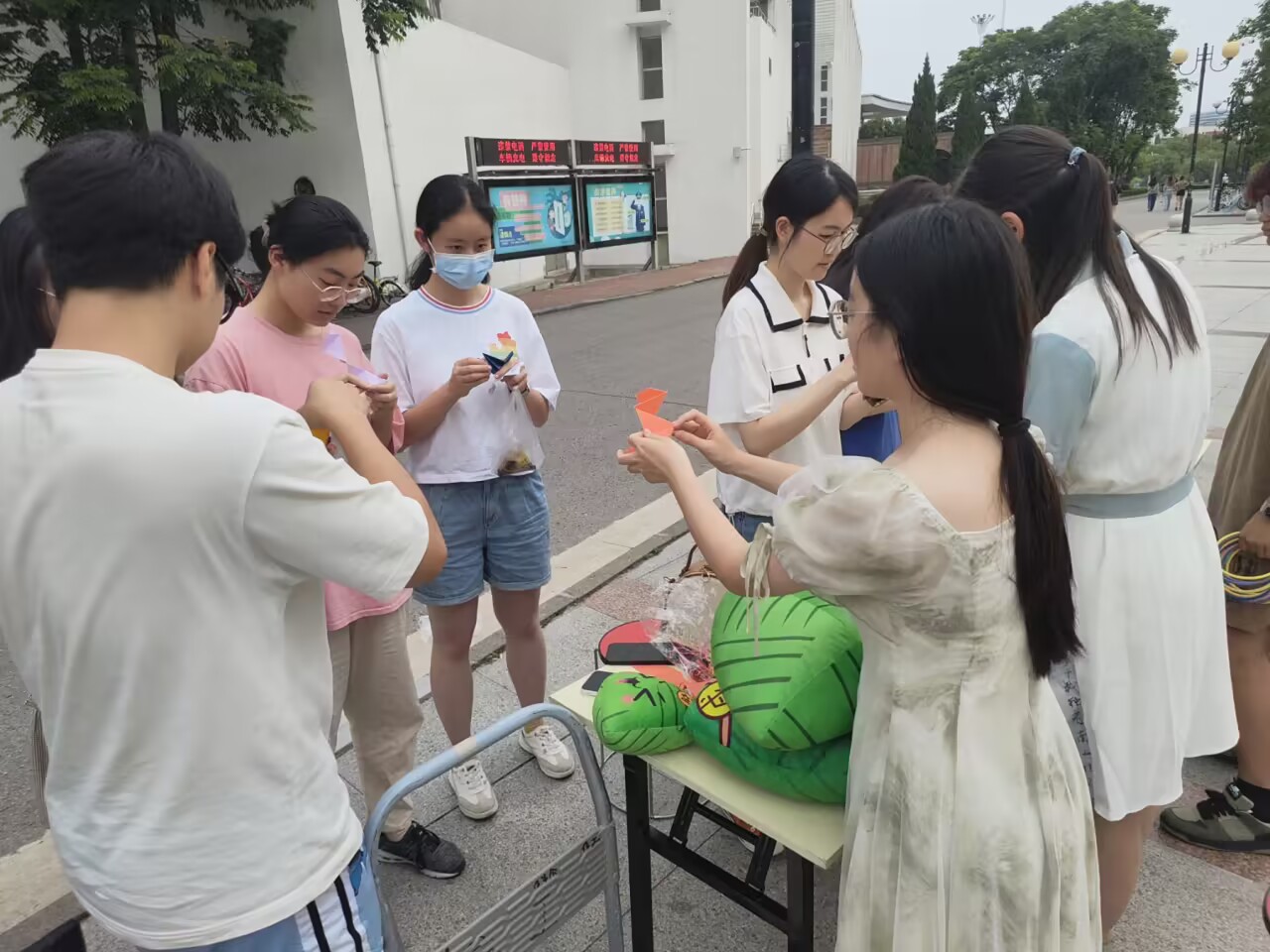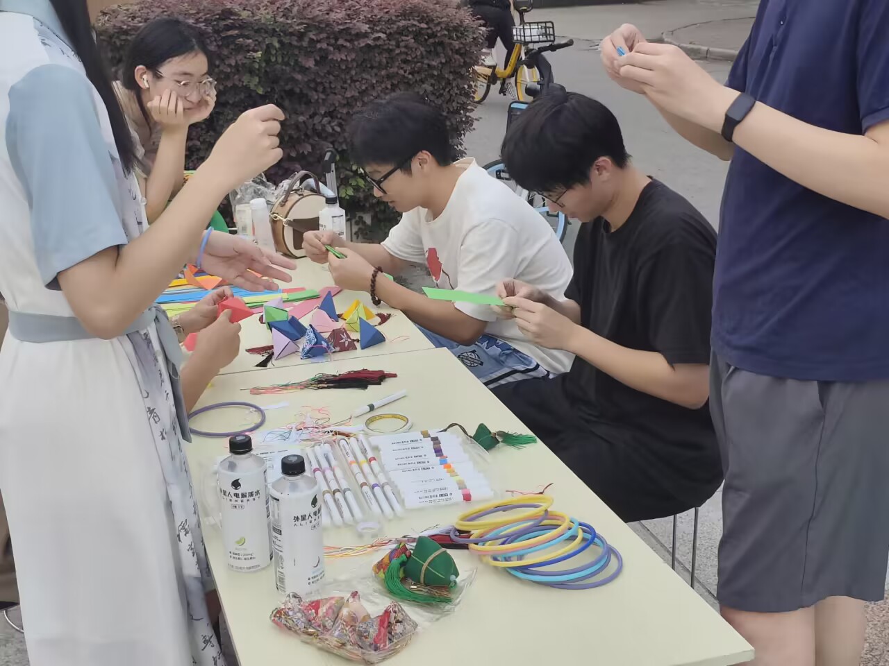 现场,同学们相互学习,相互交流,共话端午习俗,感受节日氛围。完成纸粽后,志愿者与同学们一起在纸粽上系好流苏制成香囊挂饰,用画笔等工具美化,留下心中对端午的美好印象与憧憬。同时志愿者指引同学们进行套圈或投壶,套圈成功或投壶投进一定数量后获取精美奖品。在制作纸粽过程中,各个小组讨论想法,竞争比赛,分析投票,最后选出最受欢迎的一组纸粽作品。