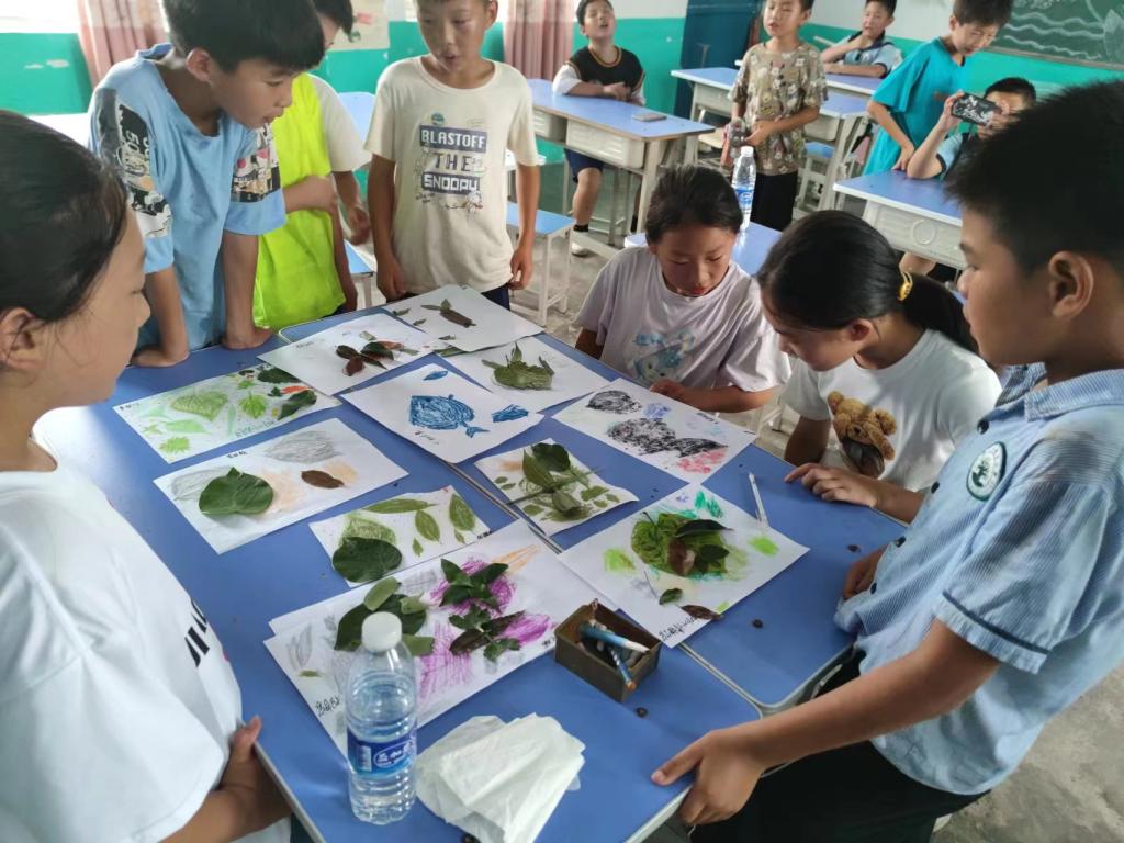 手工制作环节,孩子们积极参与树叶画和树叶拓印的制作,发挥想象力,运用不同的颜色进行创作。总结环节,志愿者与孩子们一起回顾了本节课的内容,总结了树叶之美以及树叶画和树叶拓印的制作方法和技巧。通过这节课堂,孩子们从艺术与自然的交融中,感受到了美的力量,并体验到了创造的乐趣,激发了孩子们的创造性思维,培养了动手能力。