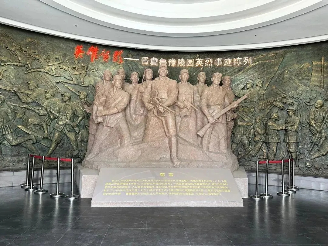 晋冀鲁豫烈士陵园,是按照党的七大精神,为纪念牺牲在抗日战争中的晋冀鲁豫四省的革命烈士而修建。烈士纪念堂内陈列有200多位烈士的遗像、遗物和生平简历。跟随着导览图的路线,小队成员逐一参观了陵园内的七个单元。