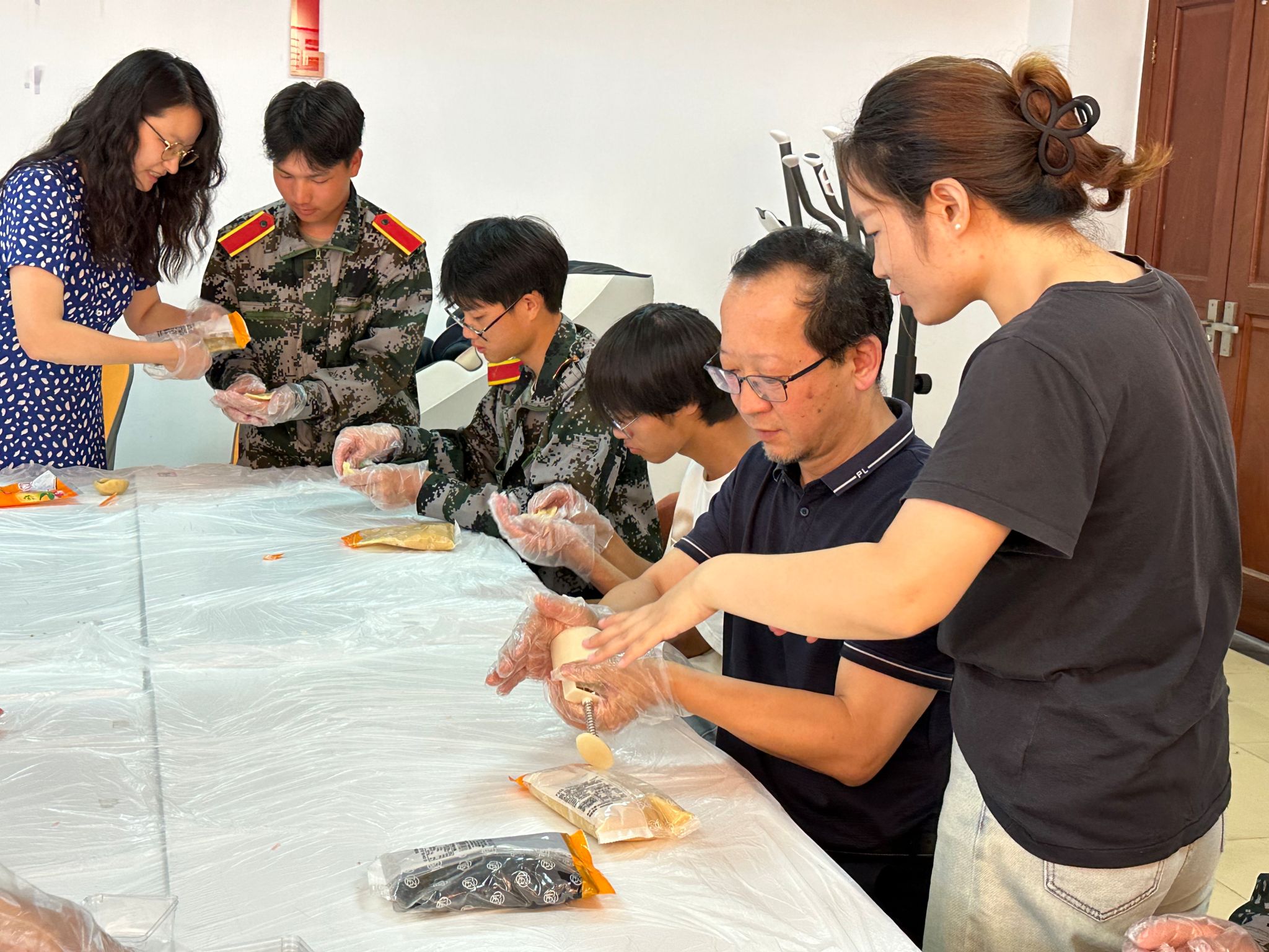 活动当天,“师生共融·月饼DIY”活动也在如火如荼地进行着。活动现场,参与活动的各民族学生和老师一起按照事先分好的小组就位,每组都配备了必要的工具和材料,包括饼皮、馅料、模具等。在老师的悉心指导下,师生们合作完成月饼的制作。