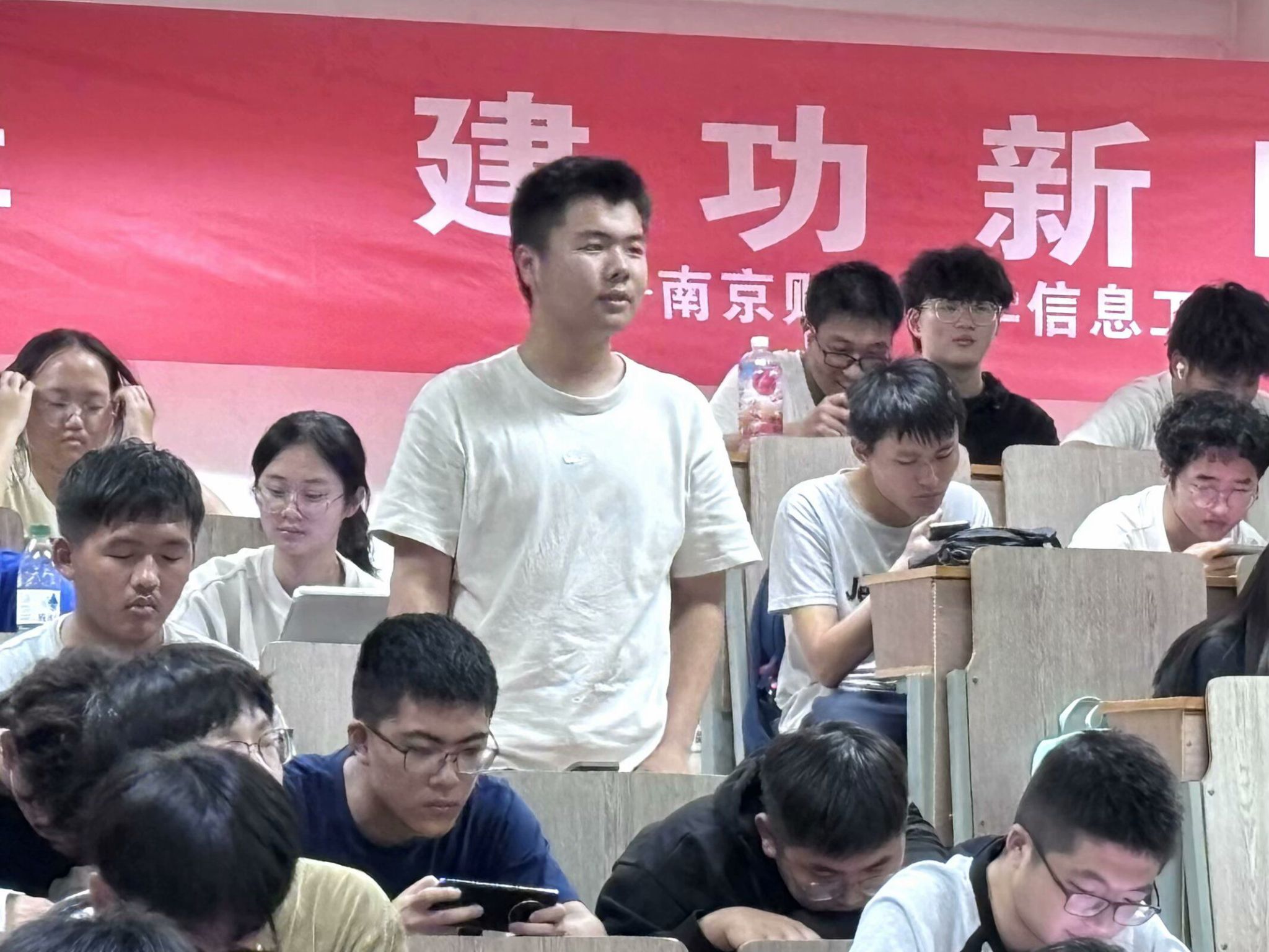 活动中,主持人介绍了一位新征程中的历史人物,氢弹之父于敏。于敏先生和他的团队在极其艰苦的条件下,凭借着坚定的信念和不懈的努力,最终成功研制出中国的氢弹。接着,主持人由点及面,讲述了中国发展中守护祖国的千千万万的钢铁军人与建设过程中无私奉献的人民群众......从个人到群体,由平凡到伟大,中国人民以他们的智慧、勇气和担当,共同书写了中华民族的壮丽篇章,让更多同学了解了新征程与新时代贴近血肉的一面。