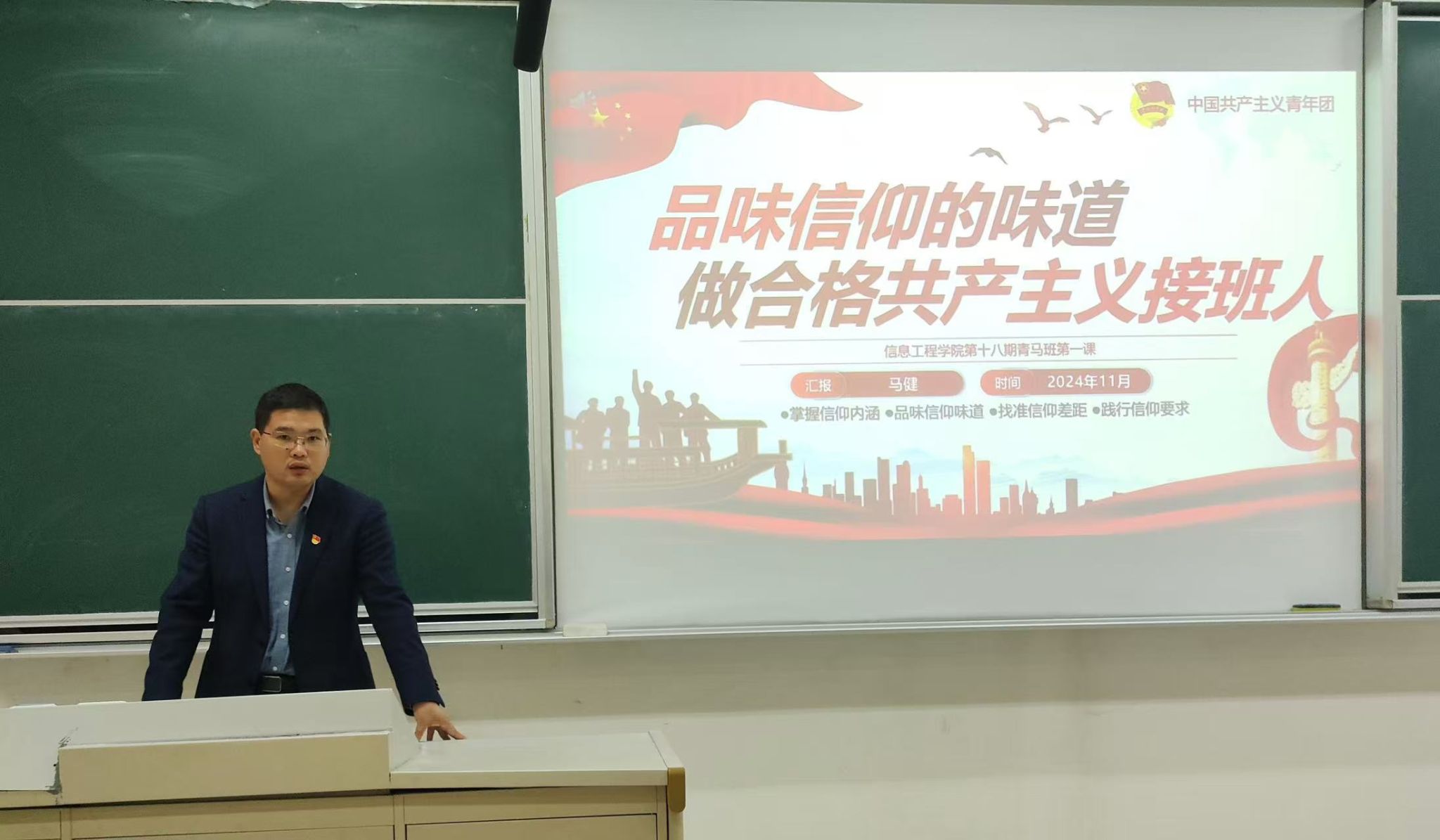 最后,马健副书记作总结发言并讲授青马班开班第一课——《品味信仰的味道,做合格共产主义接班人》。马书记指出,青年大学生要树立马克思主义理论信仰,坚定中国特色社会主义信念,在今后的学习中不断追求进步、提升自我,争做中国特色社会主义事业的合格建设者和可靠接班人。