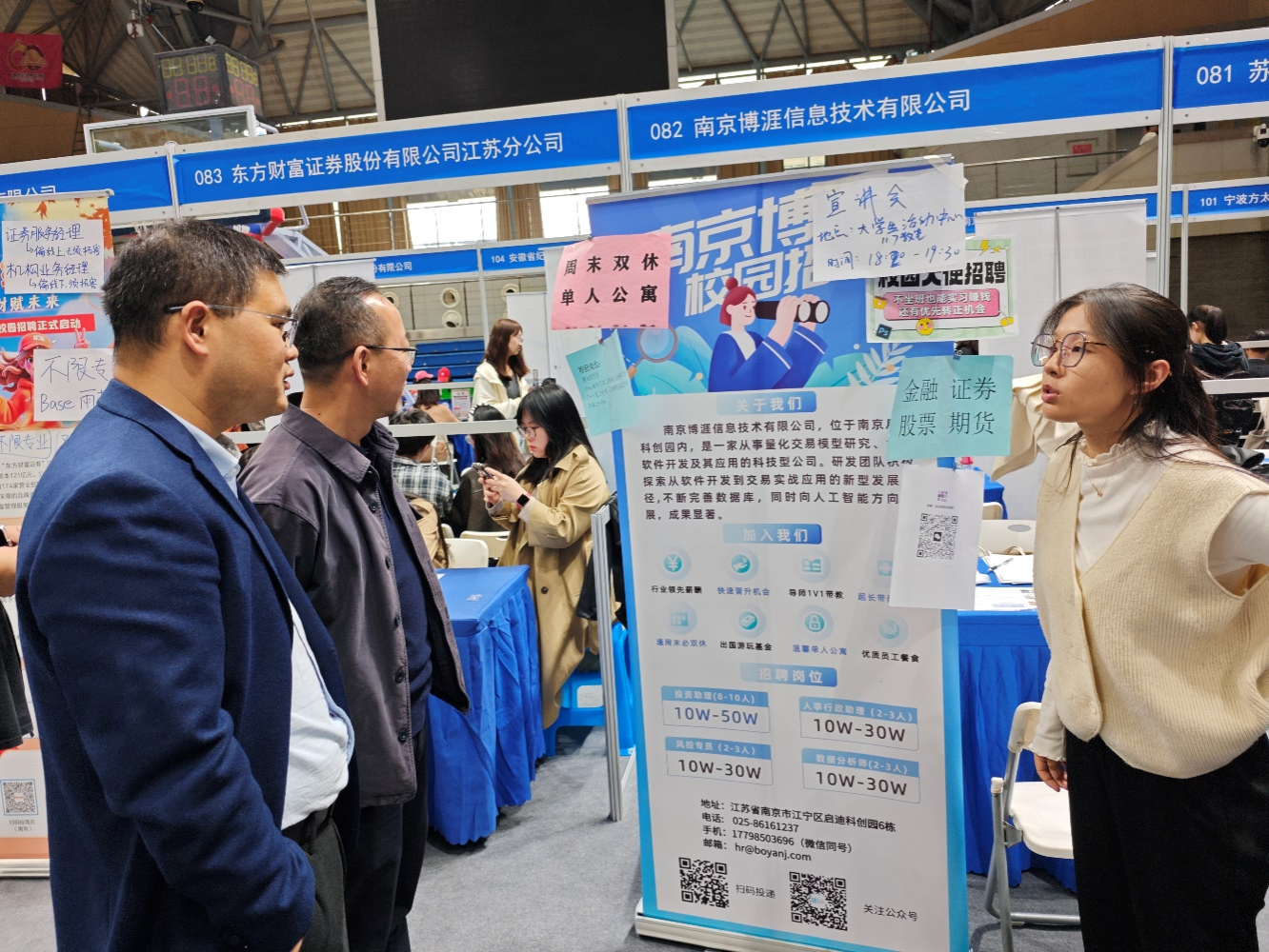 领导、老师不时在招聘单位展位前驻足,收集招聘信息,并通过班级群及时发送给毕业班同学,督促同学们及时参加招聘活动。在无锡信捷电气股份有限公司、南京博涯信息技术有限公司、江苏联宏智慧能源股份有限公司、宏智科技(苏州)股份有限公司、昆山农商银行、江苏省水利勘测设计研究院有限公司等招聘与巴比伦娱乐场