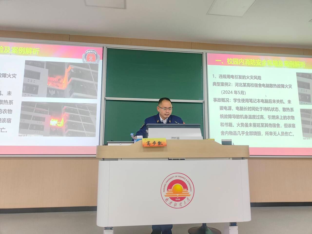 一个个鲜活案例令人触目惊心:违规用电让宿舍瞬间陷入火海,充电宝不当使用成为火灾“导火索”,实验室操作稍有不慎便引发爆燃……葛处长围绕这些同学们生活中常见的场景,揭示出日常行为中潜藏的巨大安全风险,让现场同学们深刻认识到消防安全就在身边。