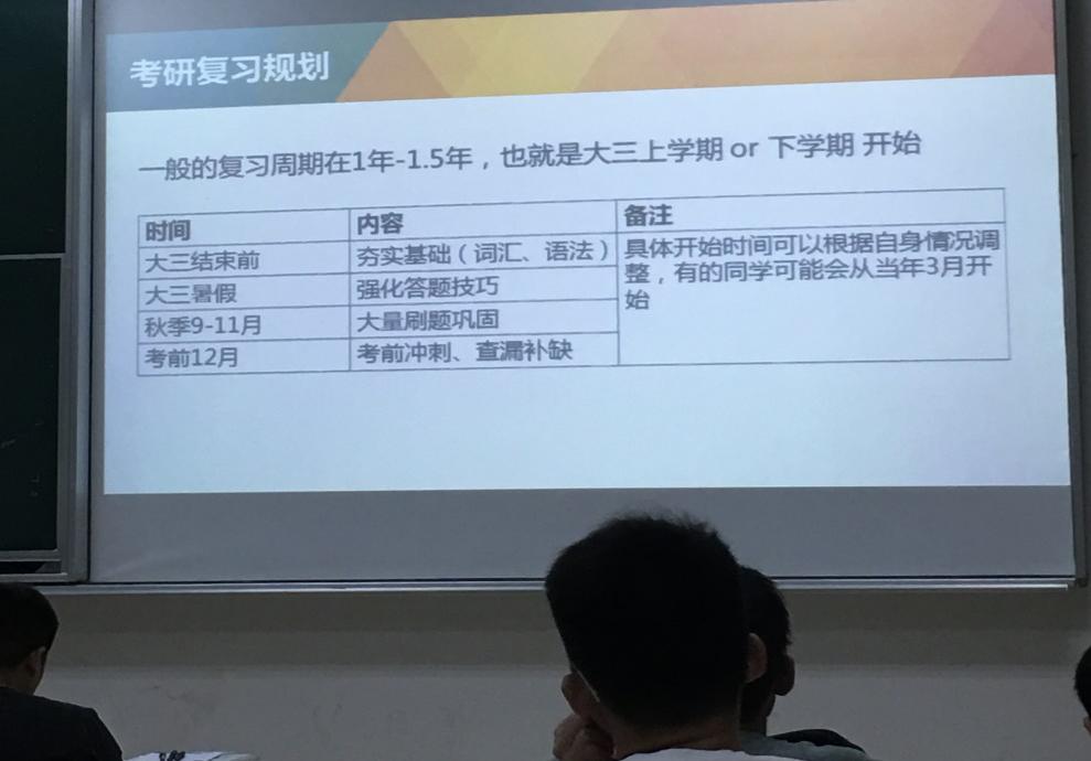 信息的网站的收集与资料获取途径。随后老师给出了比较具体的复习步骤和方法,以及明确的复习时间安排,老师重点强调考研是一场持久战,大家一定要科学合理地复习,做好时间与复习内容的规划,切不可半途而废。最后她还与大家分享了近五年考研英语的真题,结合真题讲解复习要点,让同学们认识到自己在考研准备过程中还有许多不足之处。